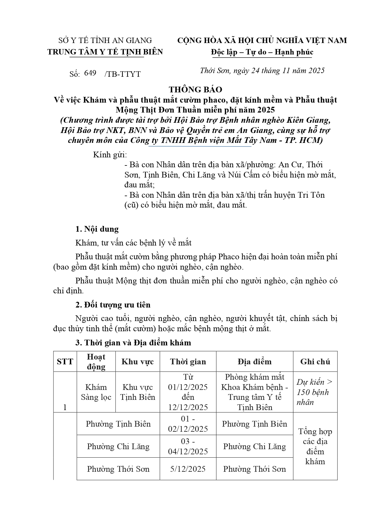 Căn cứ Công văn số: 11/KHBH-2025 ngày 20/11/2025 của Hội Bảo trợ Bệnh nhân nghèo Kiên Giang và Hội Bảo trợ Người khuyết tật Bệnh nhân nghèo và Bảo vệ Quyền trẻ em An Giang về việc Khám và phẫu thuật mắt cườm phaco, đặt kính mềm miễn phí cho bệnh nhân nghèo năm 2025;