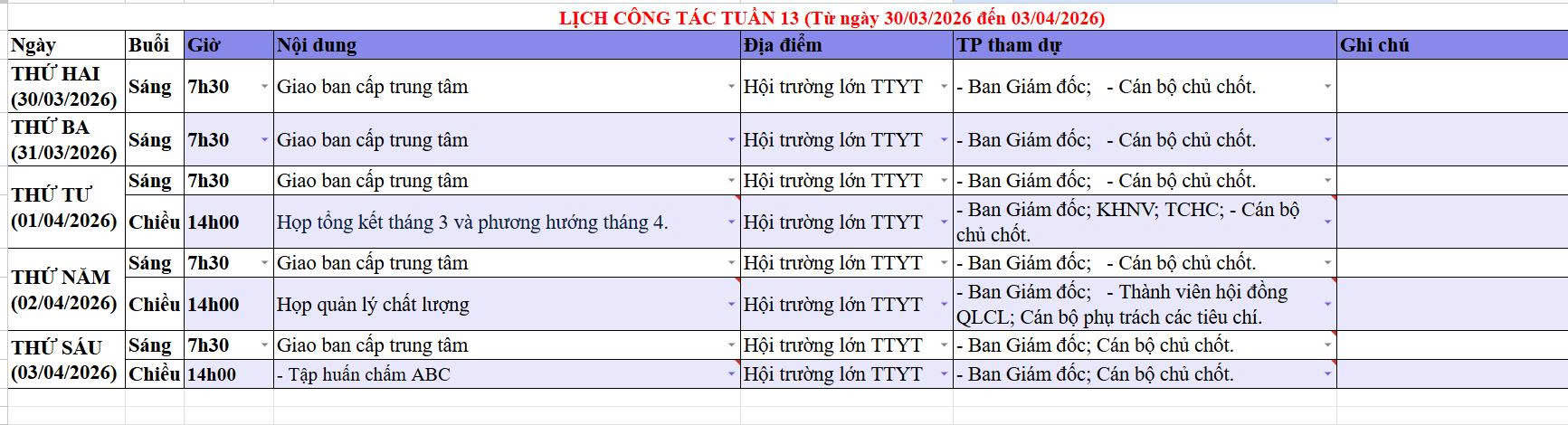 Tuần 13, năm 2026 (Từ ngày 30/03/2026 đến ngày 03/04/2026)