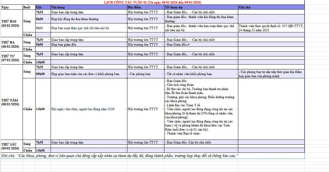 Tuần 1, năm 2026 (Từ ngày 05/01/2025 đến ngày 09/01/2025)