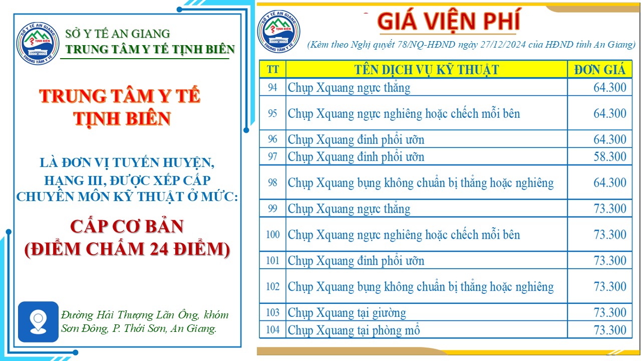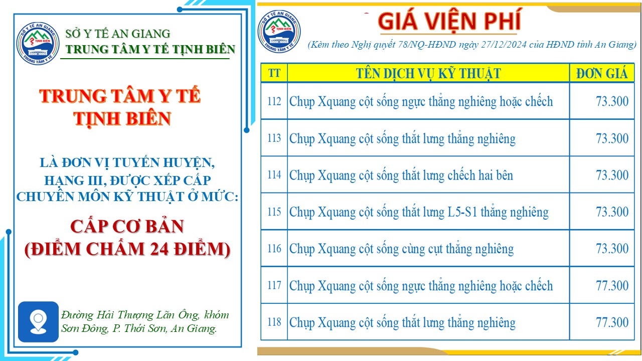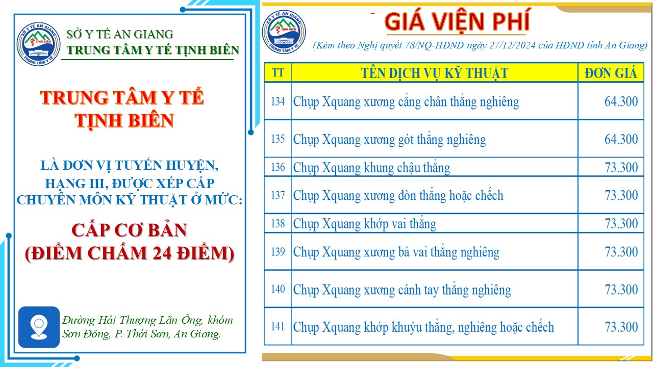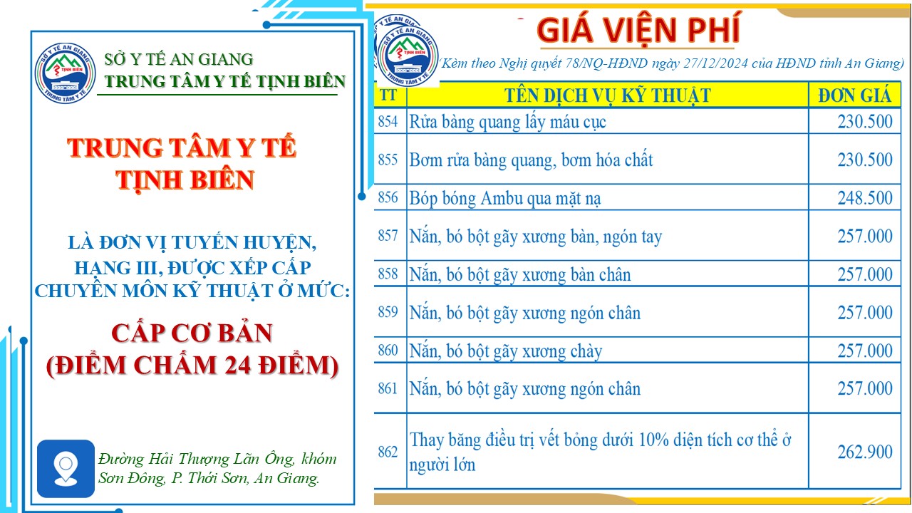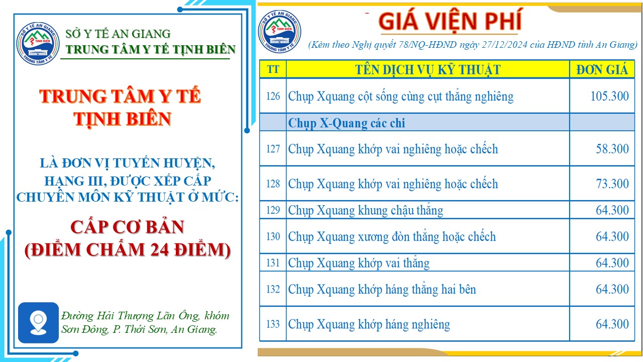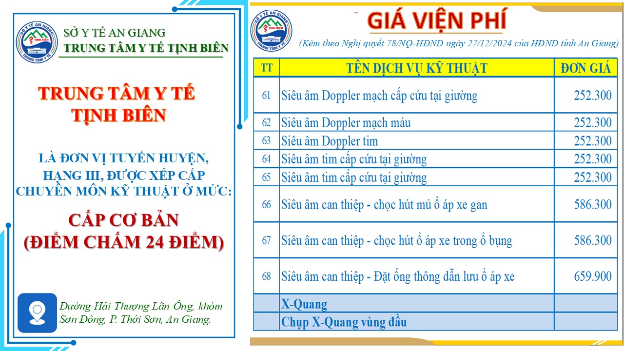 Đây là bảng danh mục giá viện phí gồm 1.013 danh mục, tổng cộng 129 slide. Mỗi slide tự động chuyển trong 08 giây. Trong đó bao gồm các nhóm: Tiền công khám, tiền giường, xét nghiệm, chẩn đoán hình ảnh, phẫu thuật, thủ thuật v.v..