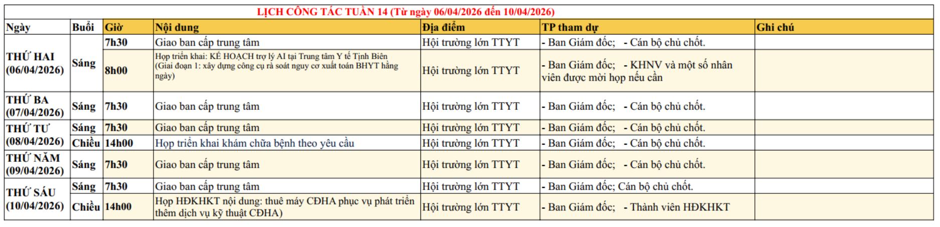 Tuần 14, năm 2026 (Từ ngày 06/04/2026 đến ngày 10/04/2026)