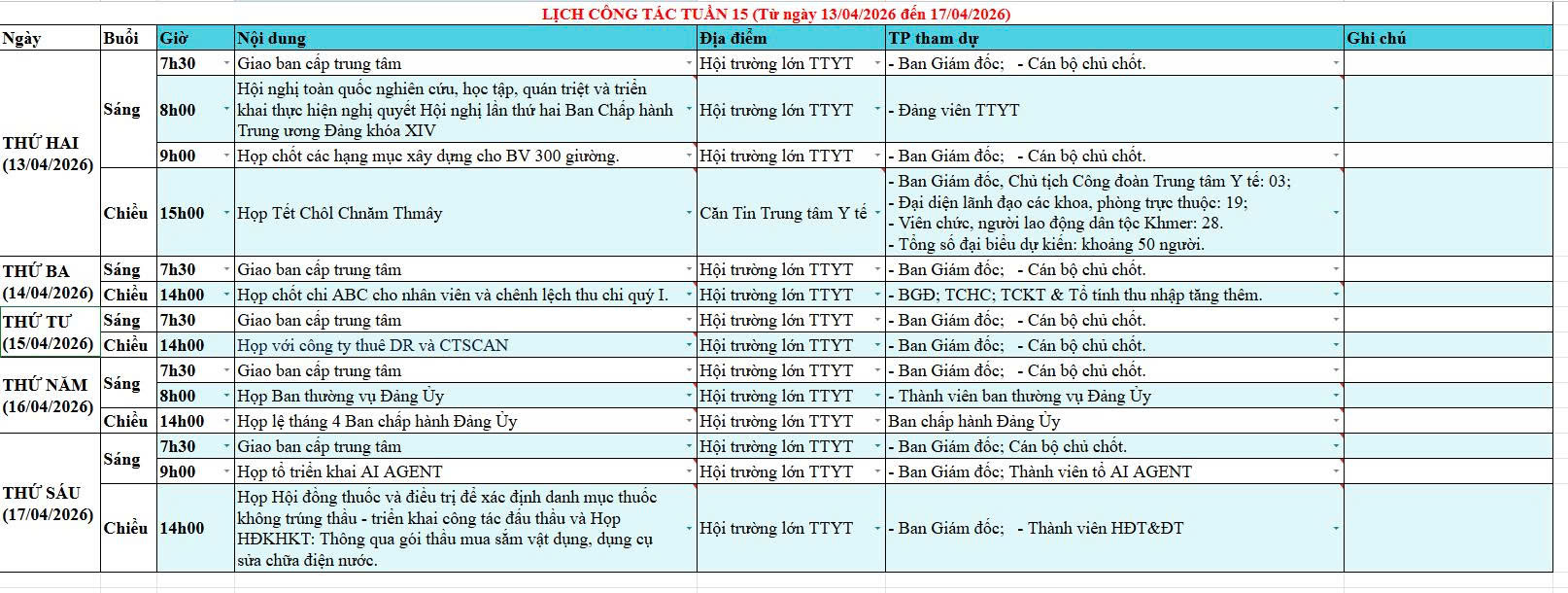 Tuần 15, năm 2026 (Từ ngày 13/04/2026 đến ngày 17/04/2026)